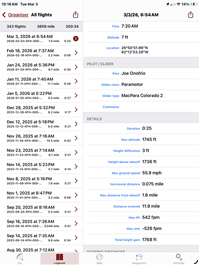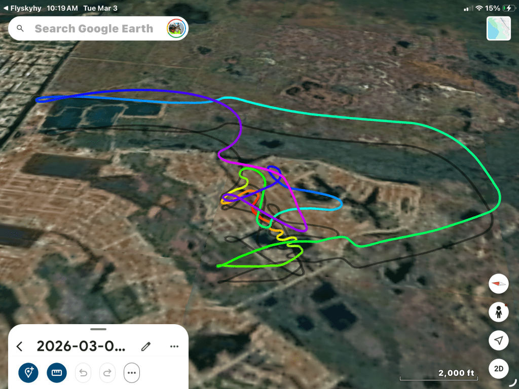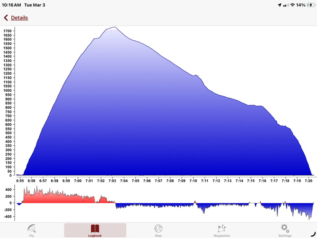 Good flight except that the wing wasn’t exactly centered and I had to make some fast and dramatic inputs to inflate and center the wing. I’m thinking the narrow opening in the nose of the glider make it easy for the prop wash to inflate one side or the other if not dead on centered.