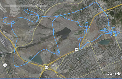Very nice flight. I saw a Delta trike flying between the hogback and the foothills moving like a bat out of hell North to South. At first I thought it was two in a tight formation until I realized that the trailing craft was really his shadow on the mountainside. Worked on level flight and steeper spirals. I really pulled some brake on the final flare ans was surprised by how much resistance there was. I’m thinking that this wing can take allot more input than I’ve been giving it. I picked up a big twig during take off it was in the brake lines close to the wing. There was enough drag on the right side that I had to let out the right trim to fly straight.