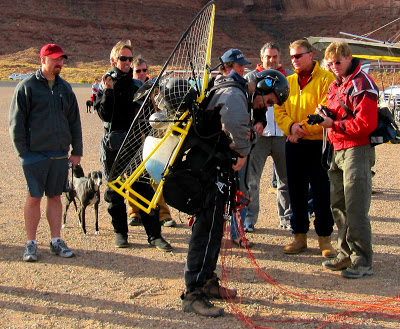Saturday Oct 11 Ah, now this is more like it! Morning was perfect and nearly everybody flew. It was tough launching uphill with shifting light winds but, once aloft, many pilots made the monument trek as did I. Good thing, by the way, my exhaust bolts were safety wired in. Wow, now this is some amazing scenery. Calling them monuments is right on.It’s weird how spooky being next to, and just over, these monoliths is. I mean its not like they’re going to suck you in, especially given the relatively mellow conditions. They look so hard, so utterly unconcerned about my wellness, so unforgiving of any misstep. I held the brakes just a bit tighter. It took a couple circuits before I’d let go to snap pictures.It wasn’t perfectly smooth, by any measure, but 2-level bumps are smooth relative to the sharp nastiness of yesterday evenings flights. That this is an airport became abundantly clear when an airplane, coming in for a landing, had to abandon his approach due to a bunch of gliders on the runway–trikes getting ready to launch. He circled for probably 5 minutes while everyone pulled off to make room. An easterly breeze made everything quite smooth for launch and landing, perfect for trying stuff out. I tried out Chad’s Miniplane with Mo’s Spice. That’s my all-time favorite combination. I also tried his 19 meter “ultralight” wing which was incredible. Mo tried it too. Six foot something Mo Sheldon weighs about 185 pounds and he was tasking a Top 80 with hefting around on a 19 meter wing at 6000 foot density altitude. Hmmm, I thought, that won’t be a stellar climb. But at least he was launching uphill. Mind you, the climb was pretty marginal, there was a steady 5 to 8 mph breeze and Mo knows his way around a wing. But still it was impressive. I had a pretty decent climb rate on my flight of the wing but I’m 35 pounds lighter, too. That wing weighs a grand total of 5 pounds. Five. The risers look like clothes lines. Talk about easy inflating, though! The evening was a bust. Once I found out the winds were again coming over the back I begged off flying altogether and, in fact, didn’t even get my wing out. Surprisingly, several pilots flew in spite of all that. One pilot took a 40 percent collapse just over the airport and I happened to be videotaping. “Happened” isn’t exactly right since I figured there was a pretty high likelihood of badness which was why I was taping. A 40% collapse, without any cravats, is very benign as long as the pilot doesn’t overreact. Thankfully, he didn’t and came around, rather suddenly, for an uneventful landing. One other piece of excitement was a pilot who landed at the other end of the runway and got whacked just as he was running it out. He fell and his throttle hand mashed into the dirt such that the motor stuck on half power or so. We saw the landing but not the fall. John Black sped down there in his truck, saw what was happening, couldn’t get the kill switch, so he reached in and yanked off the spark plug. Nice going.When this airport is in wind shadow, not surprisingly, it’s no fun to be flying. That’s why I, and most others, didn’t go up. Plus, I’d had a great morning flight, why go bounce around in this. Saturday night we all gathered at Goulding’s restaurant and told lies. It was a great time. Sunday morning, as I write this, promises to be nice early but, with winds forecast to be strong over the back by noon, I’m going to stay pretty close if I fly at all. It’s been a great trip, I’ve had 5 flights, and could easily end it on this most happy of notes. There is the matter of my now fully fueled motor…