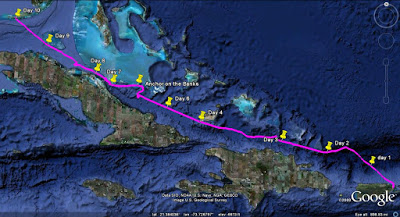 We set out at 8:30 with light wind and had cleared the Cape Icacos by 10:00. As we were approaching the Cape a single dolphin swam by and crossed our bow, a good omen. Bill shut down the motor and we set the Jib. Looking back at Puerto Rico I can see that it has topography similar to the Virgin Islands with hills rising 3000 feet ASL rather than flat like the Bahamas. The only vessels so far have been small fishing boats. Wind is still light less than10
