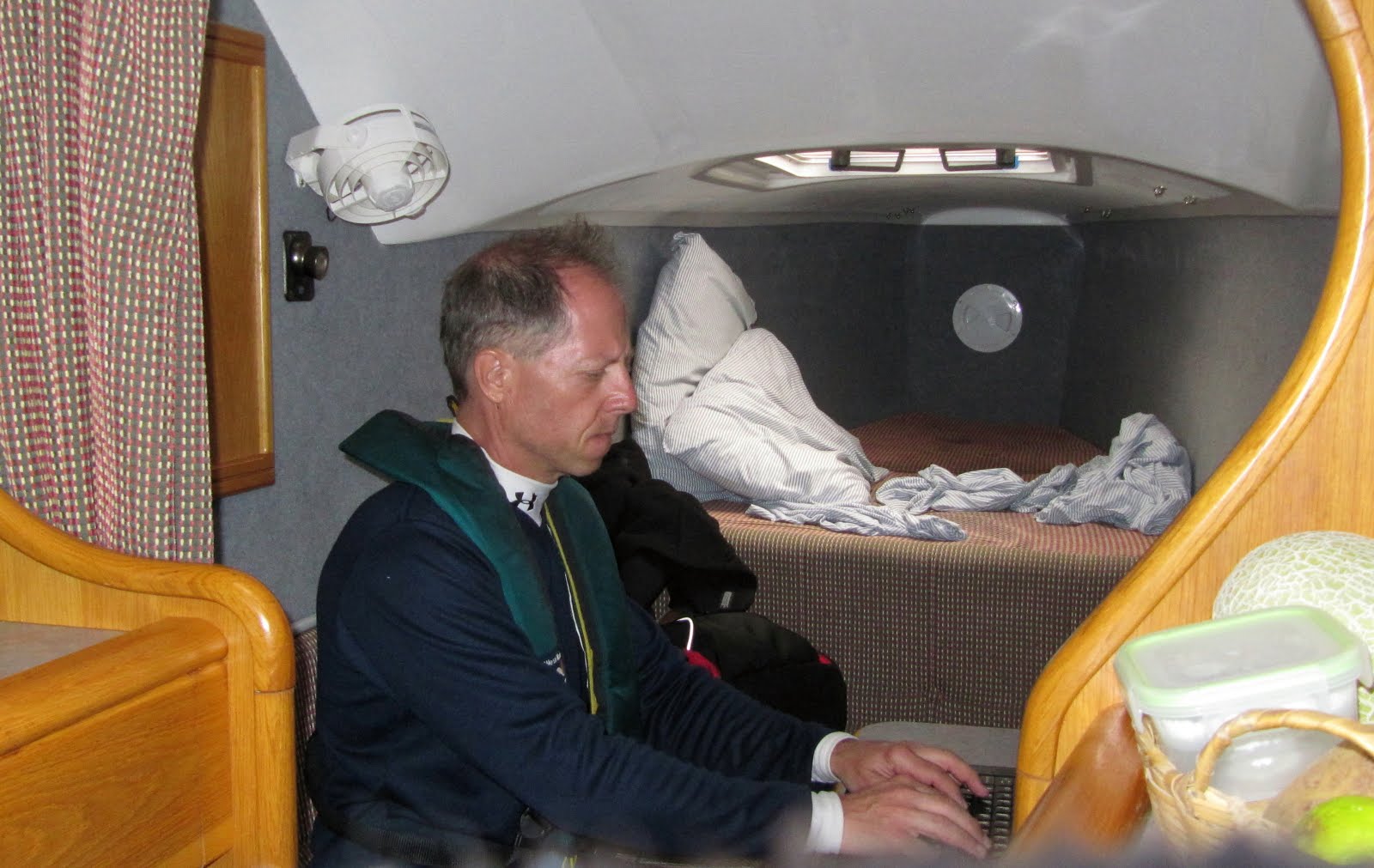 1400 hours I’m sitting at the helm watching the winds begin to build, unfortunately it’s right on the nose. Bill is below taking a nap but I’m sure he can feel the boat and knows exactly what is going on. We are motoring but I suspect that we couldn’t do any better under sail. ( 3.5 – 4 knots ) The clouds are forming a big U with us sailing right into the center. I’m going to wait 20 minutes and wake the skipper. White caps are starting to form.