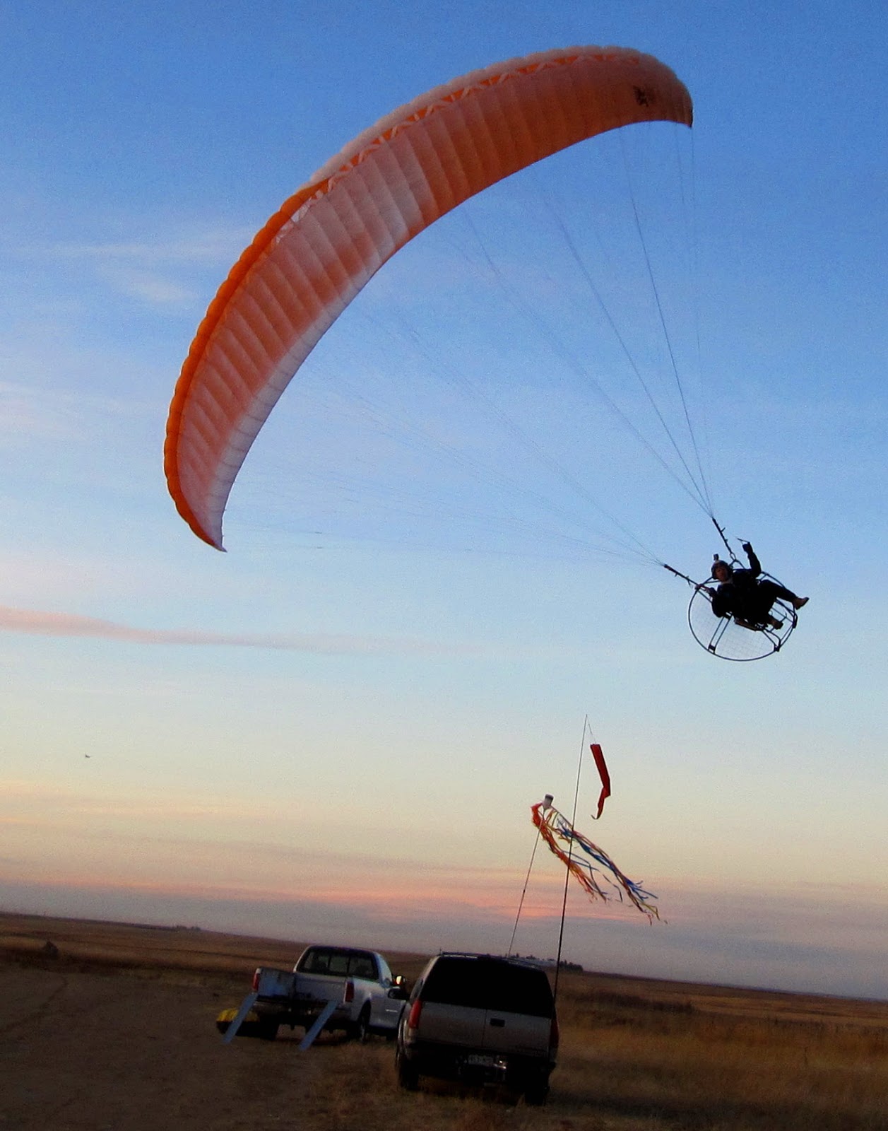 Climbing to 600 feet the the air started to get rowdy, (about a 3 on the bump scale) and the winds were 15 mph pulsing to 20. Even so…it was a good flight… I tolerated the mixing air and practiced modulating the motor. It comes up slow but smoothly and I’m beginning to get comfortable flying low again. It’s interesting that I was moving back and forth between the upper and lower toggles, I didn’t notice any back pain and the wing absolutely feels better with the top toggle or when the trimmers are out…the bottom. An hour after launch the gang started to arrive and when I landed everybody except Dan was setting up. Apparently he was still having some issues with his new rig and opted out. I landed a little after 8am, the winds had picked up but were still manageable.