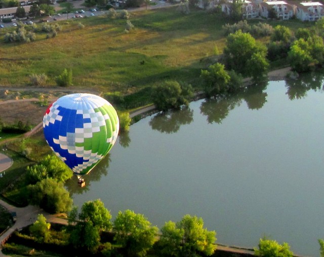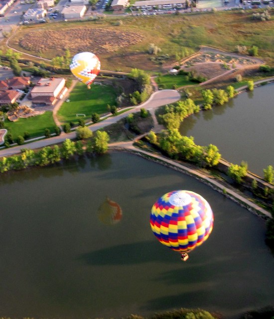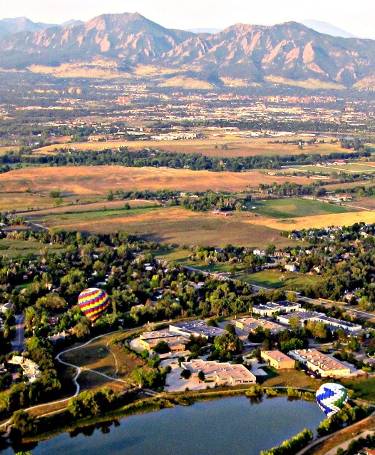There was absolutely no breeze at Vance Brand airport this morning. The sky was clear and I could see one lone balloon at altitude off to the south. After launching I noticed there were 3 others at low altitude east of the Boulder Reservoir. I climbed to 500 feet and went to meet them. There was a 10 mph breeze from the north and the Falcon picked up to 40+mph. Smooth air all the way.