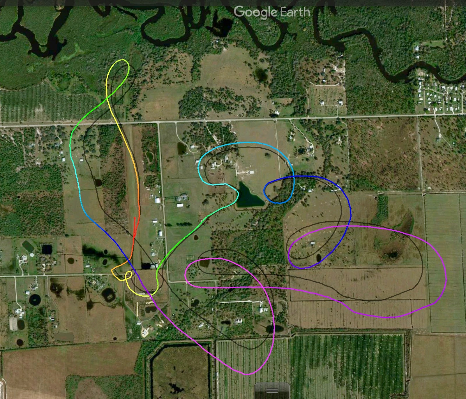 So… While I could still make out the where the airstrip was I turned back and circled down at the south end of the runway. I spiraled down at 450ft/min and held my breath. Finally, I could see Richards house from 100ft AGL. I turned onto final and glided in. I overshot the wing bag by several hundred feet but that was just fine compared with landing short and maybe hitting a fence.