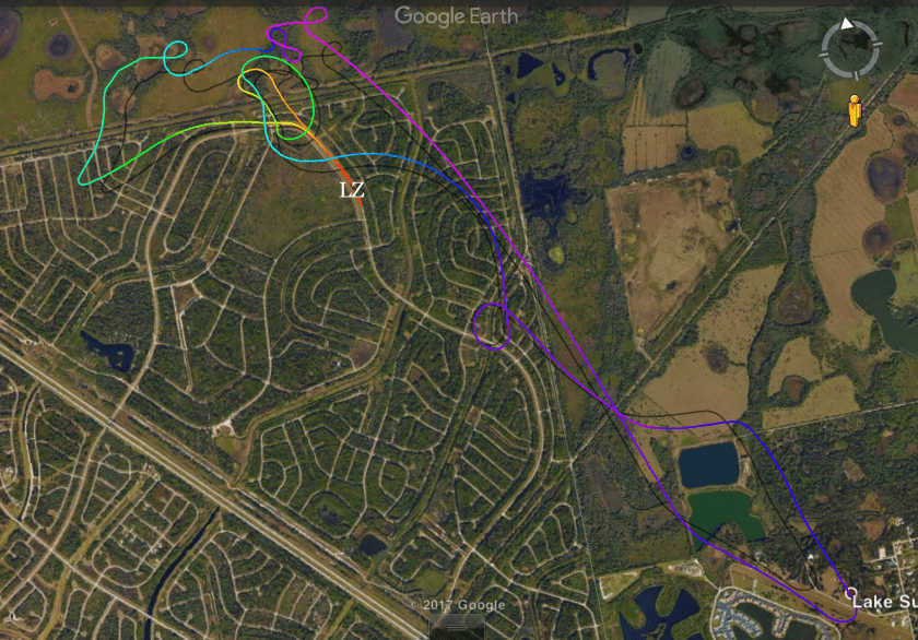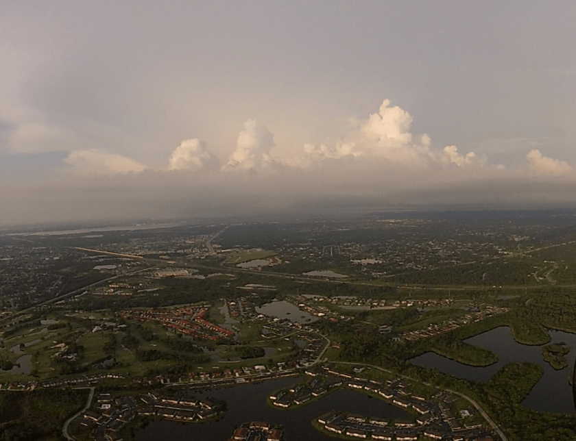 I set-up on the road and launched in nil wind following the curve of Yorkshire Loop until I had enough altitude to traverse the forest. Once up, I found the wind behind me at 7 mph. I climbed to 1400 feet in smooth air and the wind increased to 15mph. The storm was beautiful with two distinct domes boiling on top and a gigantic base dumping 5 inches of rain into the gulf. Over North Port it was smooth as butter. The only bump I felt was when I flew through my own prop wash. I flew south to the Lake Suzi Airstrip hoping to see sign of Paul C. but he wasn’t there.