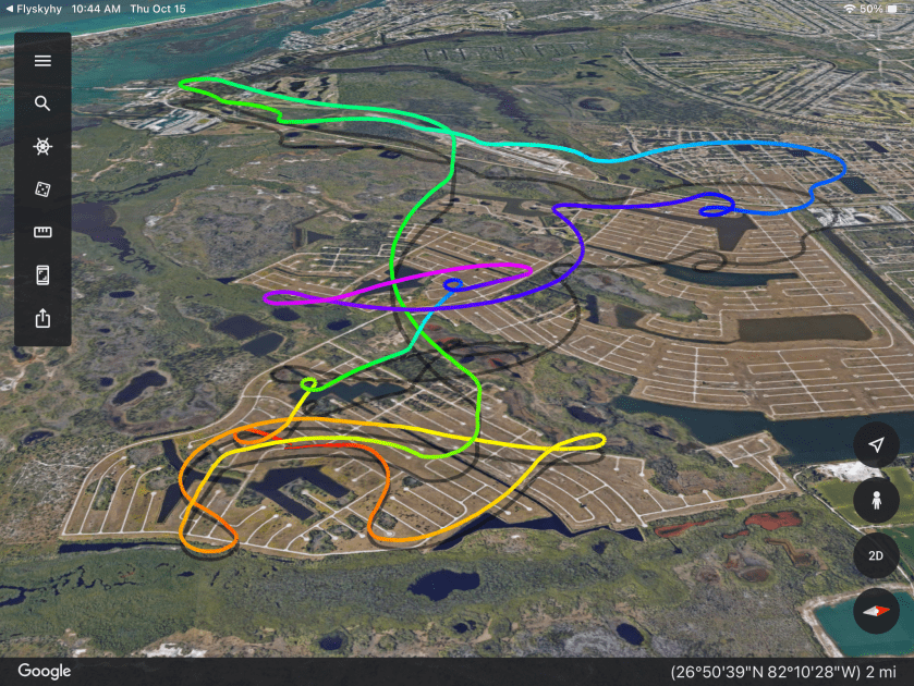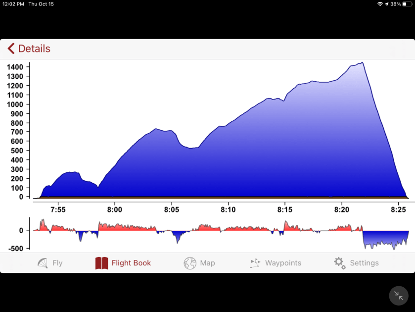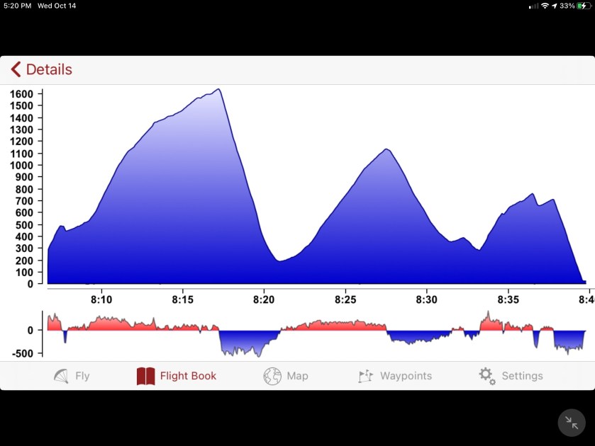 Yesterday’s flight was also good. I fumbled with the A’s because the wing was starting to dance as soon as I started the motor. Once up, all was good. I’m getting familiar with the wing again. I started a spiral and was surprised at how fast the wing descended. It’s a little disconcerting to be hanging out so much in turns. Not having a side rail or a seat that wraps is taking some getting some getting used to. I don’t feel like I’m going to fall off but I’m sure it looks that way.