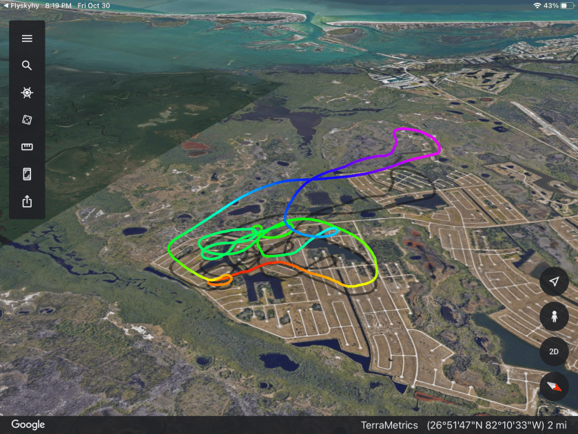 Takeoff was messy. Fortunately the wing came up clean, I committed to launch and ran up the motor. Maybe I’m getting my speed cues from the breeze in my face, it felt fast to me. I tapped the brakes and lifted of and just as quickly , I touched down before starting the climb out. Hardly what I expected with a 7 knot headwind.
