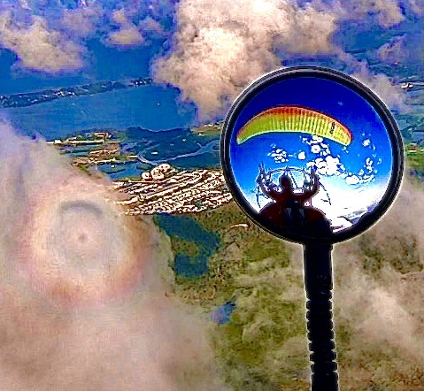The air was calm, I climbed to 2000 feet and started chasing the clouds flowing in from the sea. For awhile I flew alongside trying to get a good shot at the glory. Unfortunately the marine haze and higher clouds were diluting the light so the glory was faded and dim. I’ve never been one to dive into the clouds but today everything seemed benign so I decided to get up close and personal. In I went and in the blink of an eye, I was blind. It was like a weak steam bath , warm and wet. It was a little bumpy but there were no sharp edges.