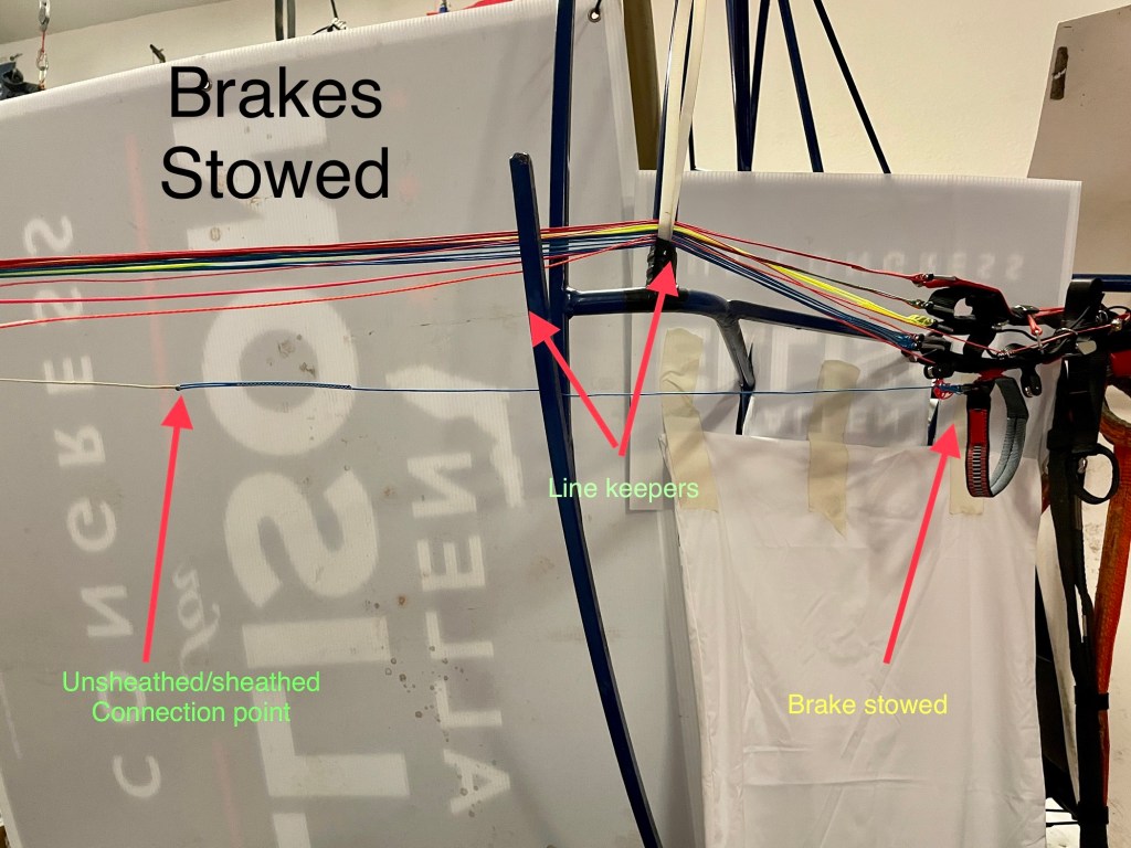 One way I’ve thought to fix this issue is by adding 1 meter (maybe more) of sheathed line to the brake and A1 lines where they leave the risers. This will of course, require shortening the unsheathed lines and lengthening the 2DmBR the 2D steering line and the A1 line. This will put stiffer lines around the keepers and move their connection point, with the unsheathed lines, away from the rig where they have been getting tangled. I don’t think this change will have a material effect on the wing’s behavior…