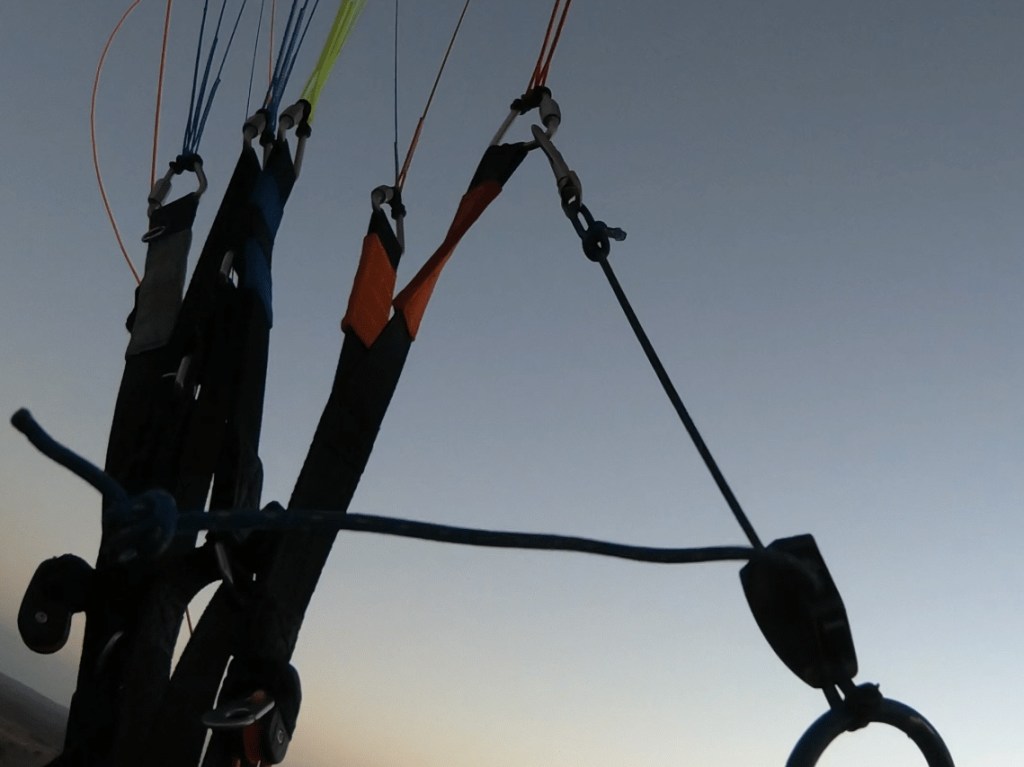 Minor Drama …. When the left side A’assist had been adjusted too short. The launch was clean but I immediately realized that the A’assists were way too tight. It was a beautiful day and the air was smooth. There wasn’t much danger of the wing going frontal but it needed to be fixed. I was able to release the right side easily but the left side would not budge. After tying several things I realized that without some kind of prying tool , there was no way to unlock the cam and there was no quick release in any of the knots. The problem was resolved when I twisted the cam, breaking the zip tie that attached it to the A’assist. The mallion snapped into position and it was all good.