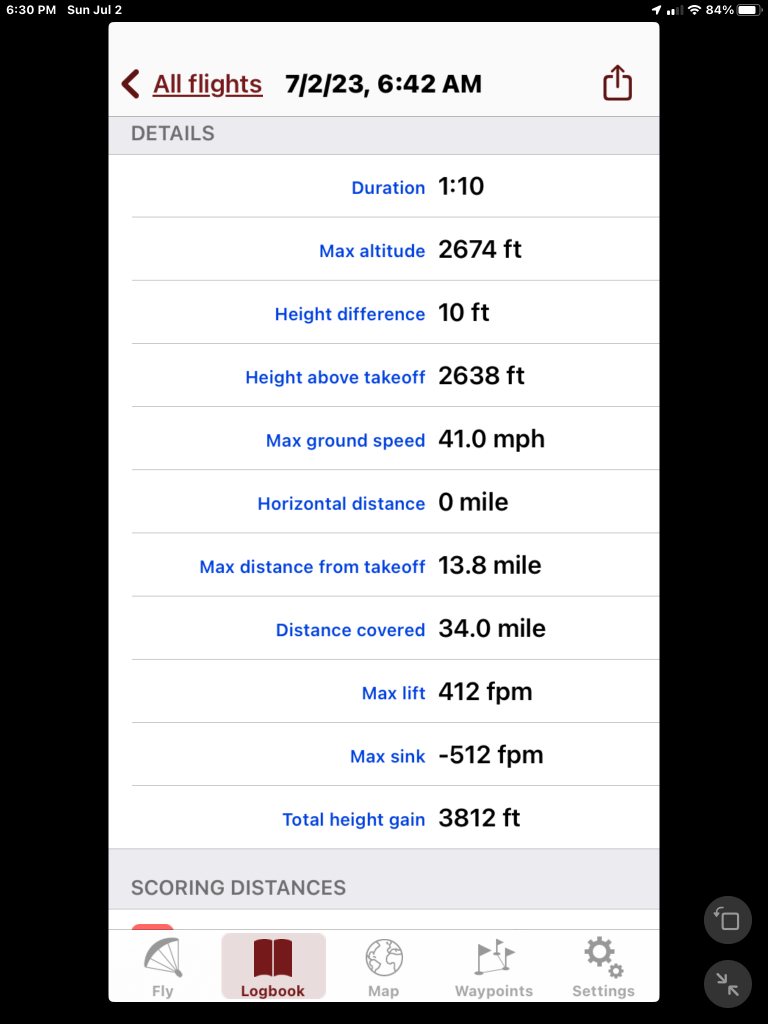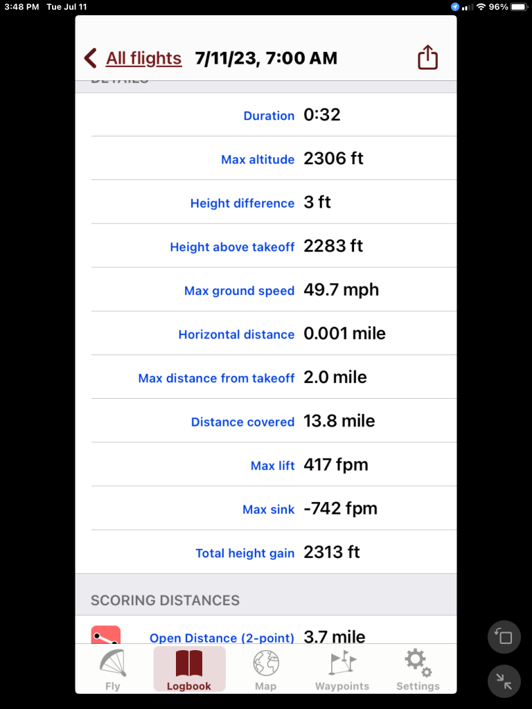 There was a crosswind just above the surface that my windsock didn’t pick up.. The first attempt failed when the wing swung left and didn’t inflate. I dragged it for awhile … no joy. Second attempt was better and in the same direction. The wing was wet and it lagged a bit but… after some wrangling I was able to get it stable overhead. Once up, I found the flow and adjusted my approach for landing.
