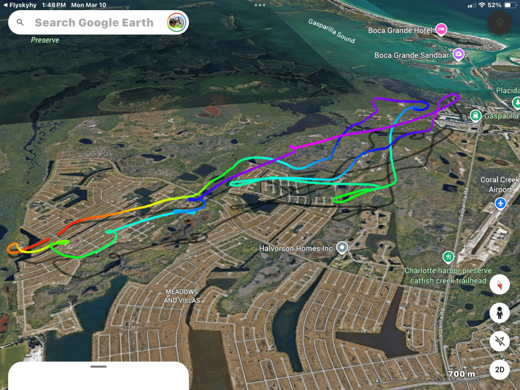 The temperature at launch was 40* F with nil wind. I would have liked to gone up to 2000+ ft but the cold air was keeping me low. No hard yanking and banking today.