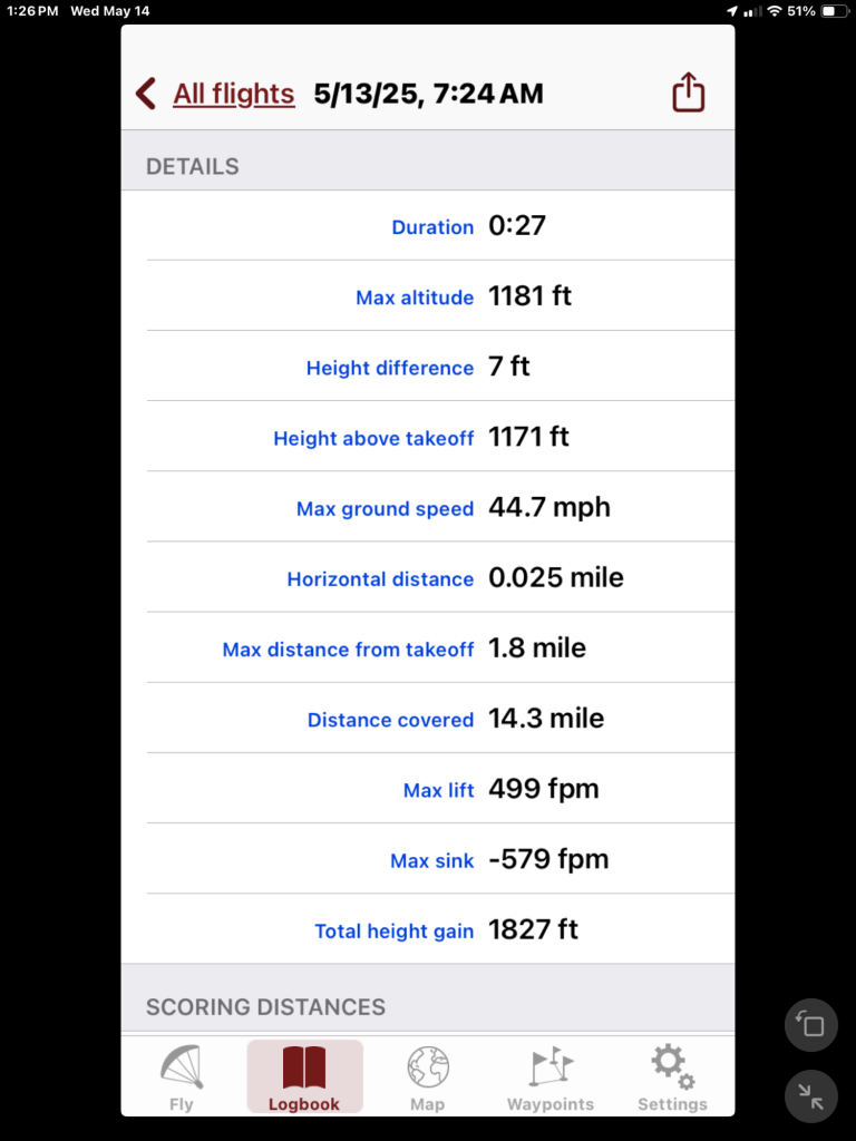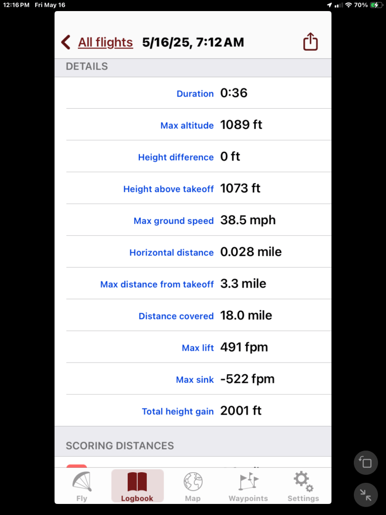 First flights with the Lift EZ after installing a new line set. The wing performed well. My first impression was that it was a little more twitchy than the Colorado and about 8mph faster. The brake travel is considerably longer and I could have used a wrap to get a little more flare on landing. When trims were “all in” it was notably slower to respond. The biggest issue was that the magnets on the MacPara brake handles don’t hold on the APCO magnets.