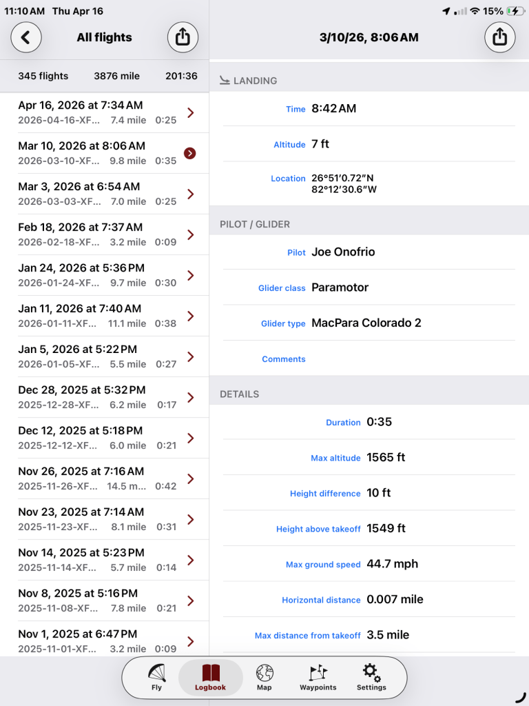 Flight 1312 Share this: Share on X (Opens in new window) X Share on Facebook (Opens in new window) Facebook Like Loading... Author: JoeO Powered Paraglider pilot since 2005 View all posts by JoeO