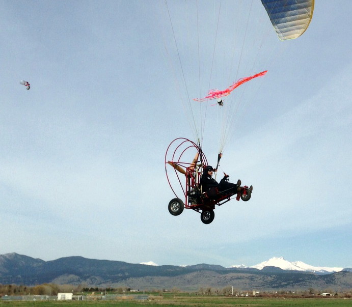 The first launch was a surprise. I popped up quicker than expected and started to float down but with a little brake I got climbing and started to circle the field while Mike got ready to launch. About 5 minutes into the flight at 1000 feet, I thought, “Did I open the fuel lines?” I had spent longer than normal warming it up and I taxied out to the launch site…AND…I’d been flying for at least 5 minutes. There was no reason to expect that it would still be running but it was and I knew I’d made a big mistake without even looking. When I got twisted around enough to get to the fuel I opened the vent and before I could open the flow valve the motor died.