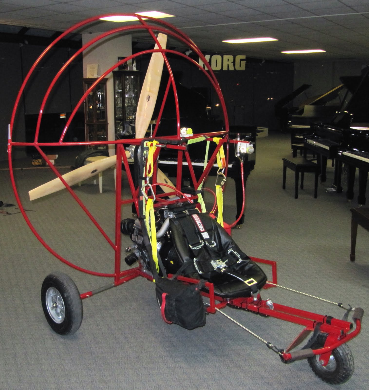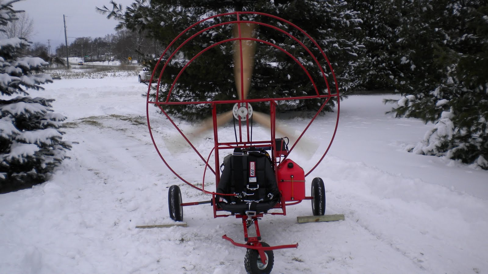 Trying to solve the chest pain I have made some modifications and this was the first time to try them out. In order to position my arms farther forward I have moved the hangpoints 1 inch and to rebalance the rig, Mike and I mounted a 12 pound weight over the front wheel. The brake lines have been lenghtened 3 inches and the brake pulley was lowered by the same amount and drawn in closer to the riser.