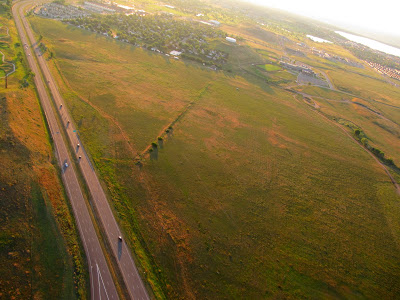 Last week Mike Savino commented on my Facebook ….Check Lists …Check Lists… Check Lists… Well…. Today, the little thing I missed was the trimmers. I’d left them open after kiting in high wind on Wed. The buggy got up fairly quickly but the climb was terrible. I closed them and did a couple of laps for altitude. The plan was to traverse the new neighborhoods high and then descend to 150 feet and circle the old tower at Stapleton. If all went well I would get a trophy shot of my shadow on the tower, unfortunately there were three or four police cars spotlighting an apartment building directly between me and the tower. I could probably have pulled it off because I doubt they could have heard the 4 stroke from 1000 feet but…No good would come from getting their attention, so I decided to abort on the side of discretion and save it for another day. On the way back after crossing the highway I explored the southern field from 150 feet. Lots of trees but plenty of room to work with.