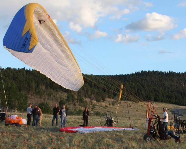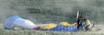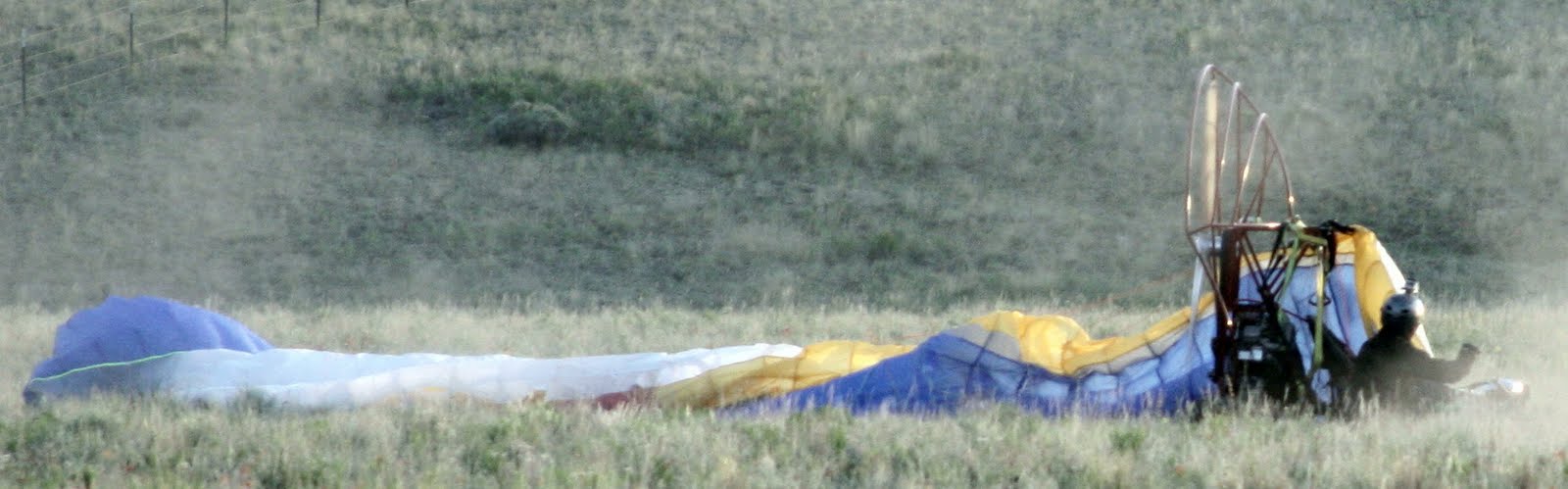 As with most incidents there were several things that contributed to the mishap. Here is the way I remember it. The first two launches with Mike’s 30 meter Eden III were fast. In both cases I took off and touched down again before getting off. In both cases I floated for a couple hundred yards before starting to climb. Once up, the flight and landing was pretty standard. Flight speed was around 32mph and my climb was about 125 feet/min.