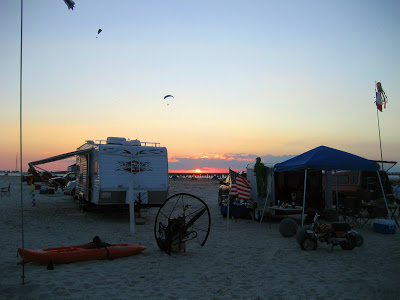 Sunday Summary: A gorgeous sunrise belied the unsavory swirls aloft. Southwesterly winds put us, again, in rotor. I had no interest in it—been there, got the T-shirt, didn’t like its fit. Joe Onofrio sent up a helium balloon and, surprisingly, it didn’t look as bad as we feared and, even I agreed that it probably wasn’t dangerous but wouldn’t be smooth and, with a forecast strong wind at noon, feared that conditions could suddenly grow teeth. When one intrepid pilot did elect to launch I got the camera. The good one, with the big lens and good stabilization. Sure enough, I was treated to show. He did a nice launch, barely cleared the fence then landed (well, kinda whacked) into the hill just south of us. Neither he nor his equipment suffered any damage beyond a flight suit tear but it wasn’t a good start to the morning. That put a damper on launches for a while but then we noticed that there wasn’t anything sharp to the wind although it occasionally did gradual changes to the opposite direction. Yup, better time that one right! Then John Black starting playing around with his quad, inflating and taxi/kiting up to the ramp, turning around, taxiing down the runway and finally launching into a short flight. It was an exquisite display of what’s possible with good throttle and wing control. You’ve got to keep enough airspeed over the wing and lead your turns. When he offered it up to me I jumped at the chance. What a hoot. I did one run up to the ramp with a 180, came around between the guys and launched down the runway. God that’s cool. No potholes, either.A digression on Quads I saw some extreme examples of the incredible stability offered by low CG quads. John’s Paracruiser was the most graphic, though. When another pilot was taxiing it, he got into some turbulence which started him swinging left/right. He lifted off and wound up hitting the pavement sideways, skidding to a stop. Had that been a trike or a anything with a higher CG, it would rolled immediately. In fact, there were two trikes that rolled and were damaged. But John’s and another similar unit, which endured highly tipful encounters, just skidded around.Both incidents that I saw would have tipped most trikes. Mind you, I like trikes and, for experienced pilots, they’re fine. Quads have drawbacks, too, of course, namely in rough terrain because the wheels hit bumps unevenly. But overall, the evidence is overwhelming that you’re less likely to flip a low CG quad than a trike. And of course it makes sense given their broader overall base. Trikes can be improved, of course, by having a low CG and wide rear wheel base, but, all things being otherwise equal, quads are the best tool for beginners learning wheels.Eventually other pilots launched into increasing turbulence and all landed after collecting too many bumps in too little time. One pilot got into enough turbulence that he decided to land a quarter-mile down the runway. His last 40 feet was rapid, pounding in hard enough to wreck the cage and prop. That was hard to watch. He didn’t add power and didn’t flare until way too late. Fortunately he was fine and hopefully will be able to get his gear repaired since he’s part of a French group visiting here. Wish I could speak French! I’d love to welcome them in the same way I felt welcomed in France. Language barriers suck. Rusty was among the last to fly, putting on a great show of foot dragging and generally playing around. He’s the one who built this incredible green motor home that mated a 1950’s truck to a GMC motor home and has a matching trailer. Overall, it was an incredible experience. Just being here is worth it. Thanks so much to Joe Onofrio, the “non-organizer” as he calls himself, for getting us all together. It has etched out a fine memory that will, no doubt, enjoy frequent visits.