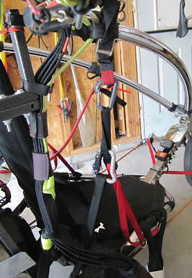 I thought perhaps I should move the foot steering forward on the bullet bars to get them away from the hang point straps, but I don’t think I’ll do that. Having the webbing behind my shoulders is cleaner and I doubt I’ll ever look at the foot steering again without remembering the day I hung from a cheap 2 inch plastic carabiner.