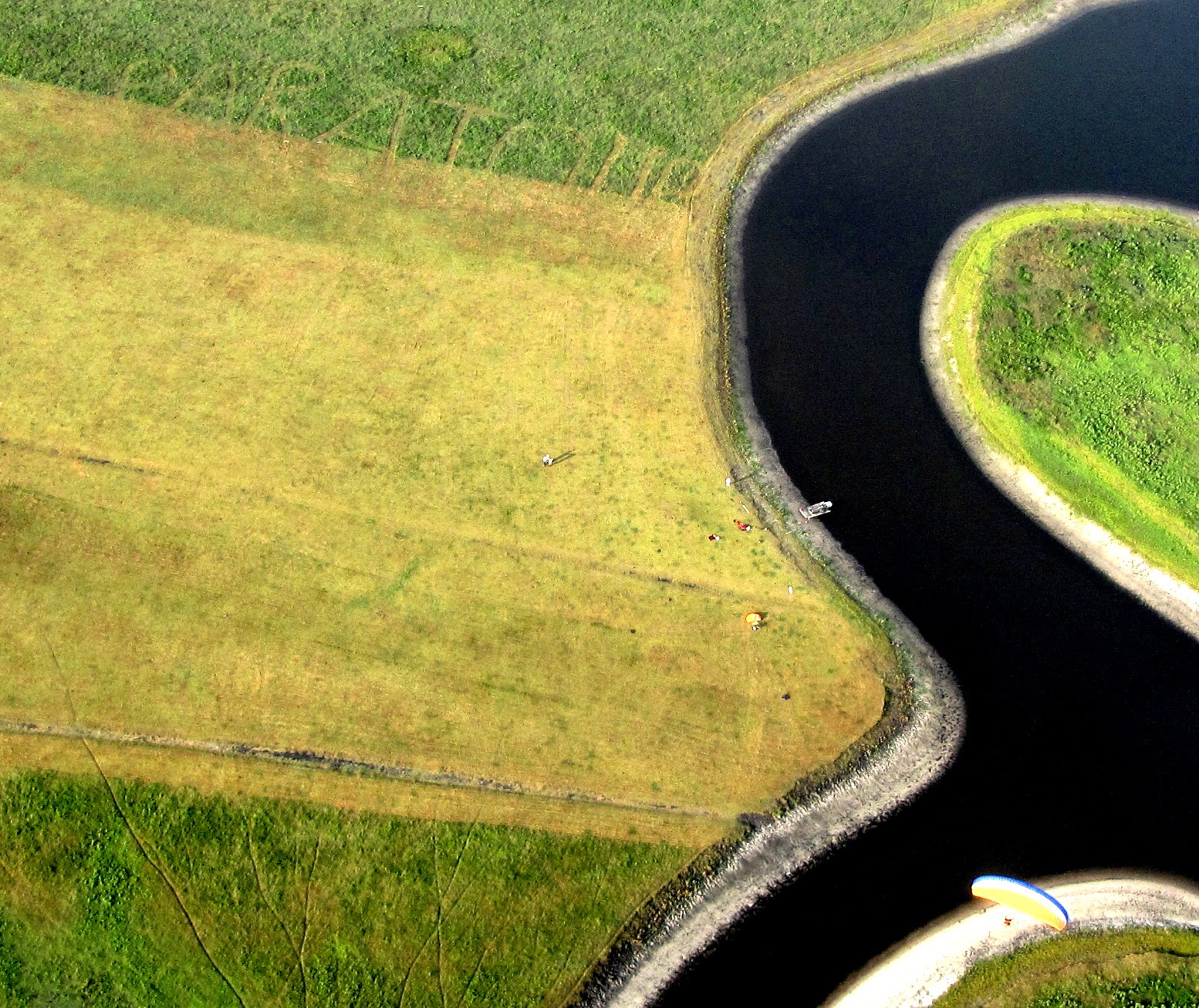 From high, I watched Eric coach one of the new guys into the air. It was a picture perfect launch and when he got to altitude I headed in his direction to ” go play”. Passing at 200 yards I swung behind and started to descend to the field. At the field Eric was gesturing strongly for me to move out of the area. The pilot was doing his first flight and he didn’t want me anywhere near his rookie. After 20 minutes I came in for a nice soft landing. Dawn and I chatted a bit and Eric explained where he was going to be working the new guys so that I wouldn’t be a concern. Then I reset and launched again.