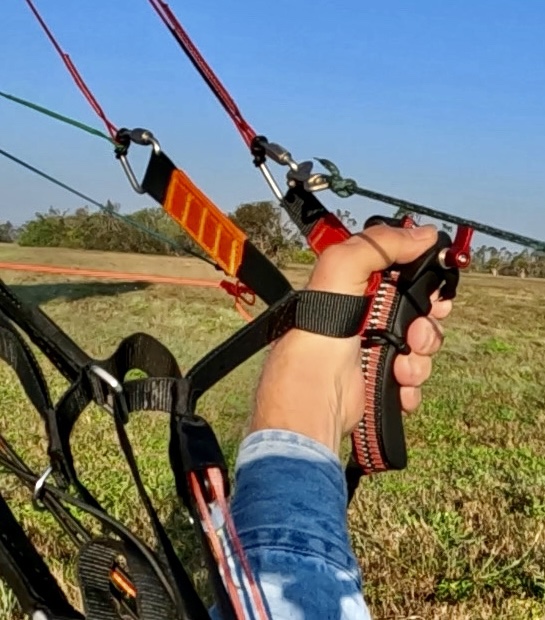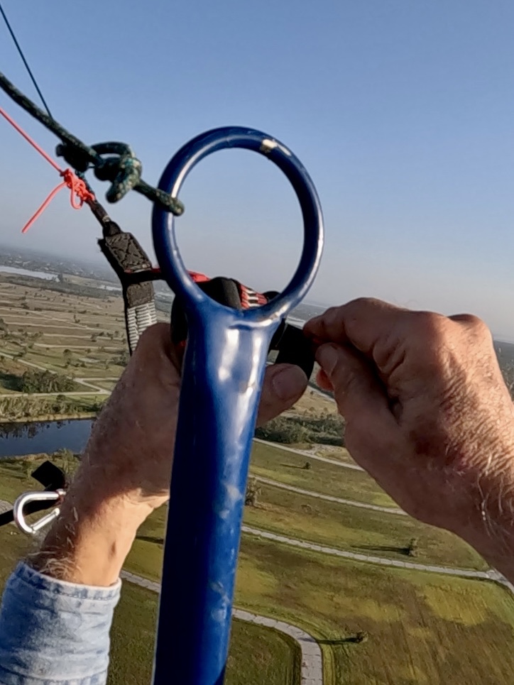 I hope Robert finds a market for the throggle but it’s not me. After a very short flight I found a couple of things that were show stoppers. Probably the biggest is that it’s not easy to clip the throggle to the risers and I’m not sure they would stay attached in every situation. I like to park the brakes and give my arms a rest. Theoretically, with the throggle you set the cruise control and park the brakes but that doesn’t work for me because even when I’m out of the brakes I like to have control of the RPMs. It’s cumbersome to keep reaching over to adjust the cruise tab especially when it’s attached to the magnets. Incidentally the cable is too long and it looked like if it came off the magnet, it could easily be sucked into the prop. So …. I stopped testing parked brakes right there.