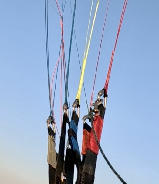 For the last two weeks I’ve been experimenting with A Assists. The idea is to have the A lines uniformly pulled during inflation with an attachment just forward of the hang point loops. The line that hooks to the A Mallon is adjustable and can be released in flight.