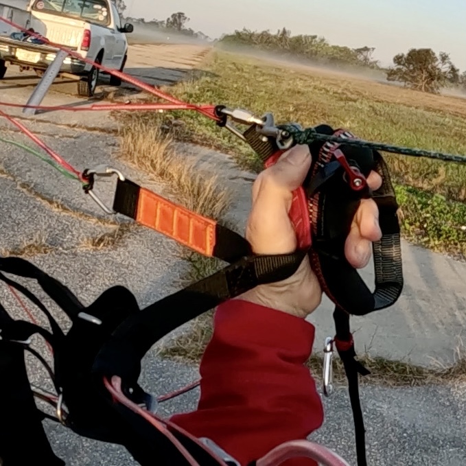 One issue was during the launch. I like to have my hands on the A lines during inflation. It’s possible to hook the #1 A with the thumb and control the throttle but once the wing is up, the A needs to be released and the thumb lever also gets released when that happens. So… for a moment the thrust is reduced. On a hard surface, like this morning, it was no big deal because the cart had very little drag but on grass the cart would slow immediately causing the wing to surge, forcing me to brake at a low speed to keep the wing overhead. It would delay the launch and add unnecessary complexity. The A assists can do the job without me being in the A’s but I like to feel the wing during those crucial seconds.