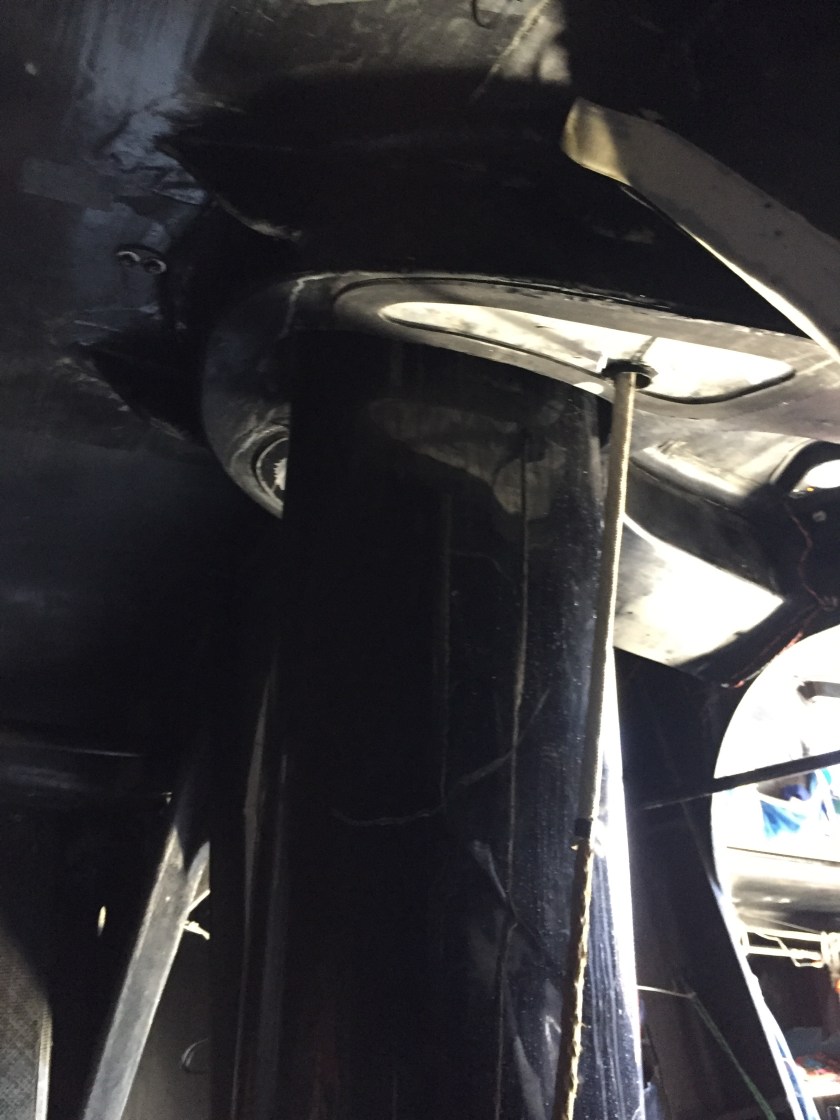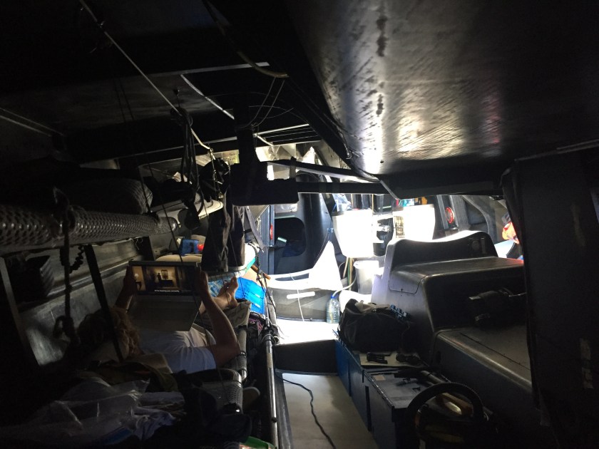 Below, its as black as coal diggers… you know what. A very small galley greets you at the bottom of three long steps. Aft of the companionway is crew quarters with 16 bunks slung along the hull. The center is linkage for the 9 huge winches above deck. The Nav station is aft between the last set of bunks. Aft of the nav station is another compartment housing the steering gear connecting the twin Carbon wheels.