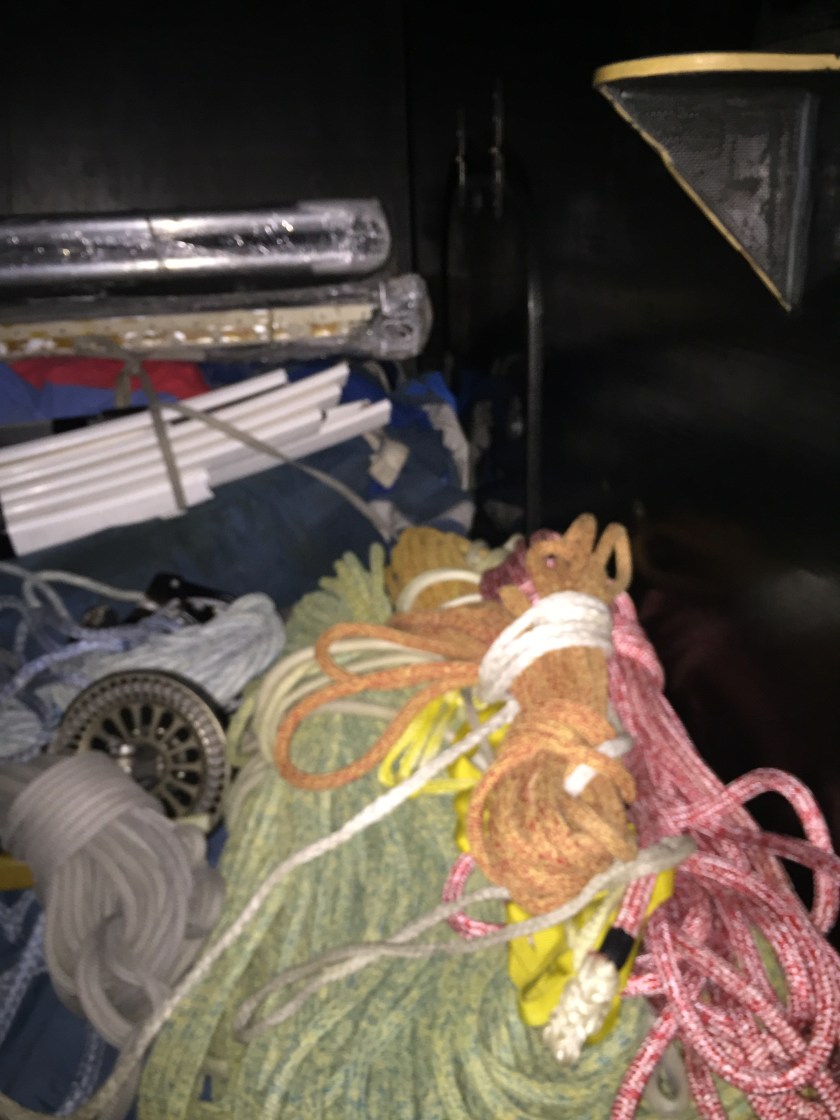Forward is gear storage, the head and another large compartment leading to the bow where sails and covers are stored. All black.