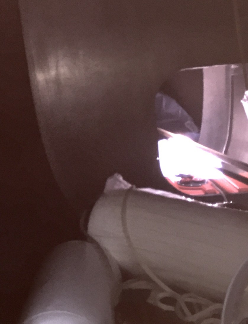 We descended to 30 feet and picked up a line that would take us to midship. I let some air out of my BC and holding the GoPro in one hand and the decent line in the other I began to glide down toward the ship. Wow! There it was. Visibility was good but not good enough to see the entire ship. We arrived slighty aft of midship and headed toward the Kingpost that was the highest point. Descending toward the balloon launch deck I flew over the massive radar discs. The outer skin was gone and what remained was the skeleton of disk, it was covered with growth, and looked like the product of a giant, obsessive compulsive sea spider. I followed the master diver along what might otherwise be called the lido deck, to an open bulkhead a third of the way to the stern. We entered a large open space that spanned the width of the ship. I think it was the Balloon hanger. At one end there was a second level and half of it was open to the sea overhead. On the port side there was a 80-100 pound grouper hanging out, he slowly exited the ship as we approached. From there we passed through the Balloon Hanger to the gym space. Then we reentered the ship and followed the corridor and stairs down to the carpenter and paint shop. It had been stripped of everything except a bench bolted to the center space. I hunkered down and spent a little time using the flashlight examining the area. There were the beginnings of stalactites hanging down from the ceiling. Right now, it was just pliable sea growth, but I could imagine, if left undisturbed, it could grow into something to behold. There was a workbench bolted to the floor and I envision the sailor standing there working on a project. The master diver beckoned and I followed him to the far side opening. Once outside we followed a flight of stairs up a deck to another space where I could see light from several large openings. We slowly worked our way down and through the ship traveling toward the stern. After crossing several frames we emerged below the fantail through an opening by the transom. From there we moved back to midship where we picked up the mooring and made for the surface. Bottom time was 17 minutes at 102 feet with a 10 minute decompression stop.