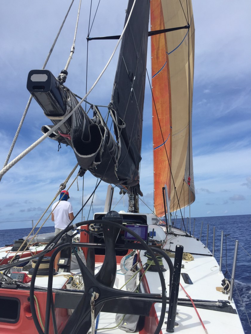 At dawn Kuba discovered the main halyard had parted. It didn’t take much to convince Johanas to go up with my GoPro. He recovered the halyard, affixed the sloppy wind instrument and put a different halyard on the main. New to me was the locking mechanism that takes the strain off the halyard. It kept the main up when the halyard let go but at the same time , we couldn’t drop the main until the skipper went aloft and reattached a halyard.