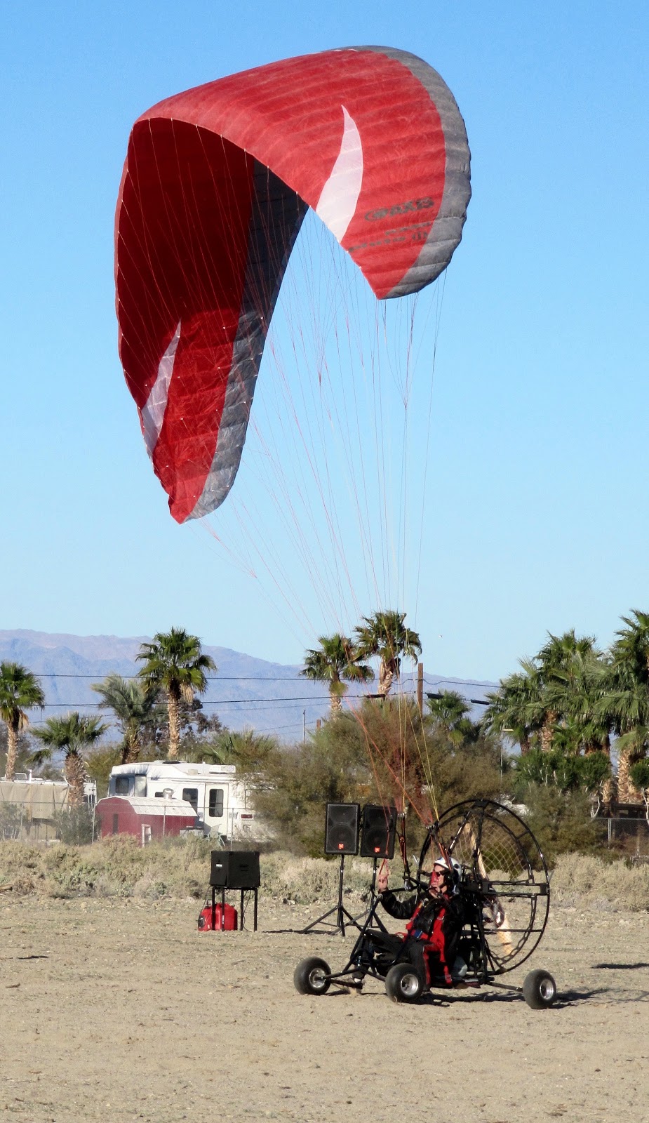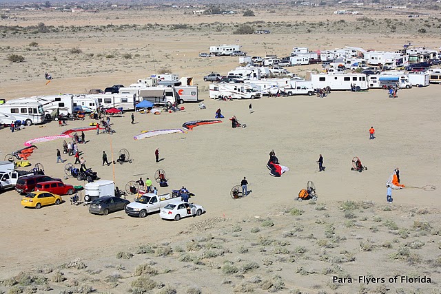 Up early and into the sky. Beautiful morning to go high and say goodbye. Everyone was packing up when I walked the flight line one last time to say my farewells. I hooked up with Pierre and Greg and we made plans to convoy to Glamis together. When we got there the wind was blowing 8 mph gusting to 12 or 13. I set up but aborted after seeing Greg parked at 50 feet. Watching him fly the trike buggy made me remember just how great the combination of Simonini and a Trike Buggy is. Very nimble machine. We made a wolf camp and sat around the fire until well after dark telling stories and enjoying the moment. I used Roberts Pop-out tent since my was broken and slept like a baby.