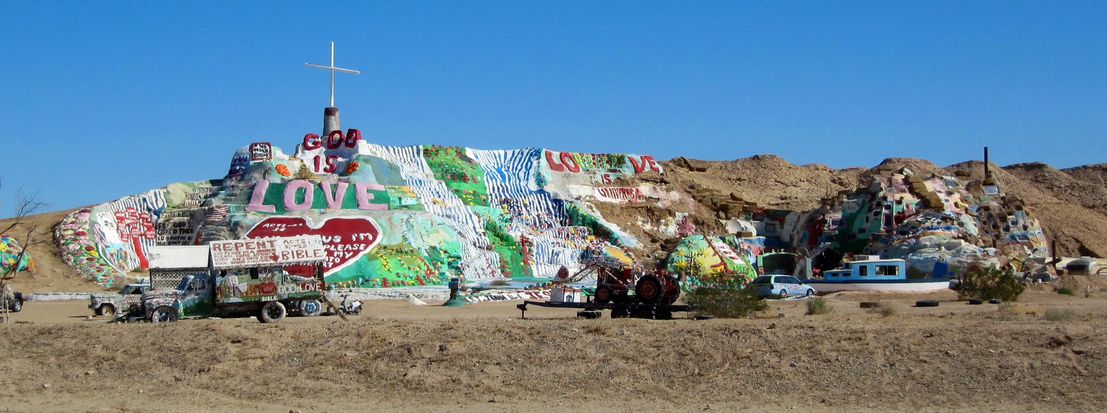 Salvation Mountain ( http://www.salvationmountain.us/ ) is located in the lower desert of Southern California in Imperial County just east of the Salton Sea and about a hour and a half from Palm Springs. Salvation Mountain is Leonard Knights’ tribute to God and his gift to the world with its simple yet powerful message: “God Is Love.” Leonard’s passion has lovingly created this brilliant “outsider art ” masterpiece resplendent with not only biblical and religious scripture such as the Lord’s Prayer, John 3:16, and the Sinner’s Prayer, but also including flowers, trees, waterfalls, suns, bluebirds, and many other fascinating and colorful objects. Salvation Mountain must be seen to be fully appreciated as those who have made the journey will attest. Its 50 foot height and 150 foot breadth is made totally of local adobe clay and donated paint and is truly unique in the United States and probably the world. From its Sea of Galilee at the bottom, to the big red heart in the middle, to the cross at the very top, the reoccurring theme of “Love” is everywhere at Salvation Mountain.