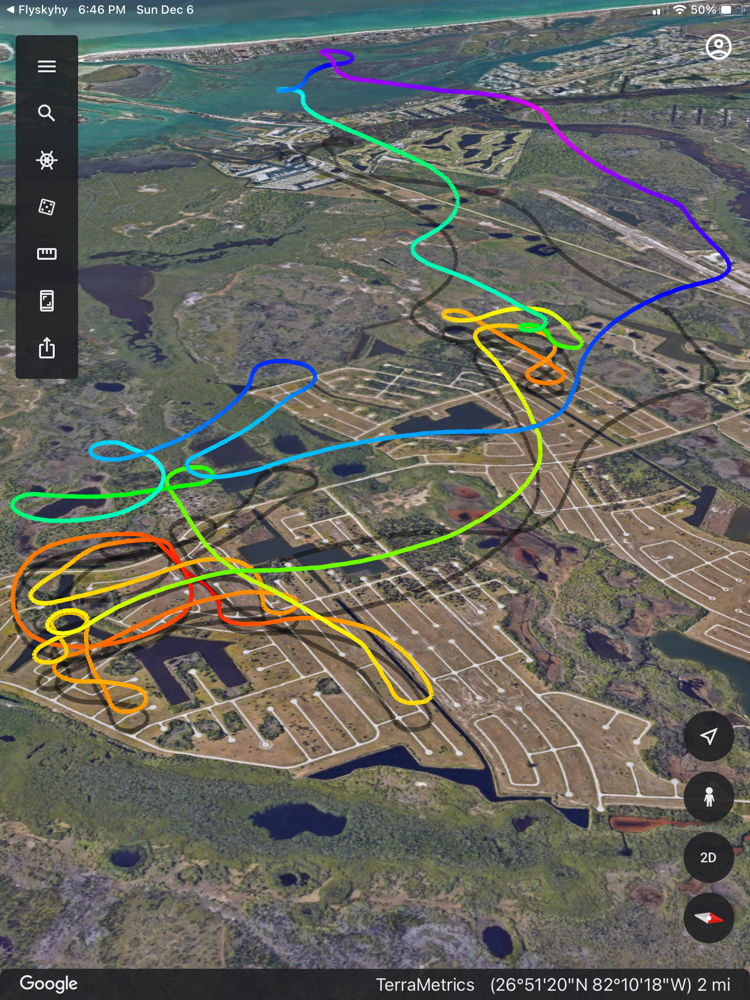 I quit climbing about 15minutes into the flight and enjoyed “buttery air”. The only turbulence I encountered was my own prop wash after some button hook turns. The decent was smooth to 500 feet where it got spicy real quick. I setup to flyby the windsock and hit some nasty sink at 200 feet. In a heartbeat I was 100 feet lower and still descending . I powered up and flew level through some strong rotor coming off the jungle. Eventually I got above it and circled back to a surprising soft and slow landing.