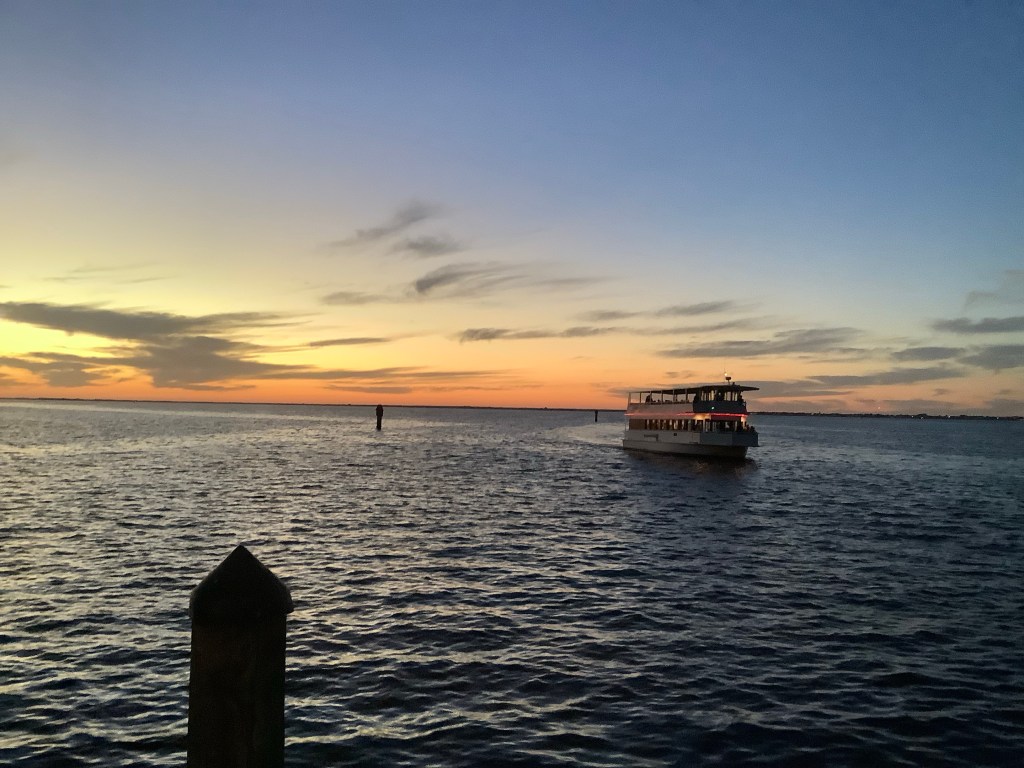 Harry’s Blackened Grouper Sandwiches were excellent. We chowed down and watched the sun set and the moon rise. Then, when the Harbor Queen pulled in with her cargo of Pale Riders from up north, it was time to go.