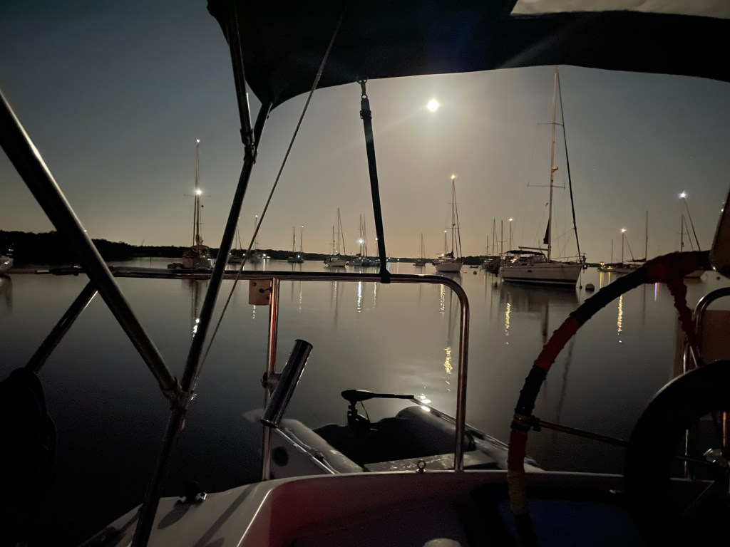 We made a last minute stop at the CVS and cast off at 2130 hours The ride down Harbor, wasn’t fast, The sky was clear except for a enormous full moon and few puffy little clouds. Only the very brightest stars were visible. The moon turned the carbon sails to shimmering gossamer. They looked the wings of a huge dragonfly. It was very cool.