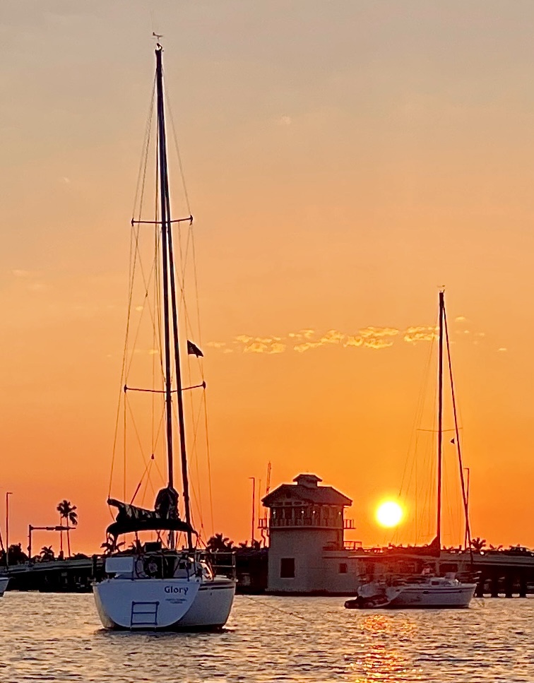 At sunrise we were approaching the southern tip of Sanibel Island. Glenn was fresh from a good nap so I laid back in the cockpit and let him helm the boat. An hour and a half later we turned East toward Fort Myers Beach. The approach wasn’t simple, we had to divert to the south before making our final approach to the entrance of Matanzas Pass. At 1000 hours we passed under the Fort Myers Beach Bridge. I spotted an open mooring ball at the front of the mooring field. We were about to pick it up when the field manager came alongside and informed us that the space had been reserved.