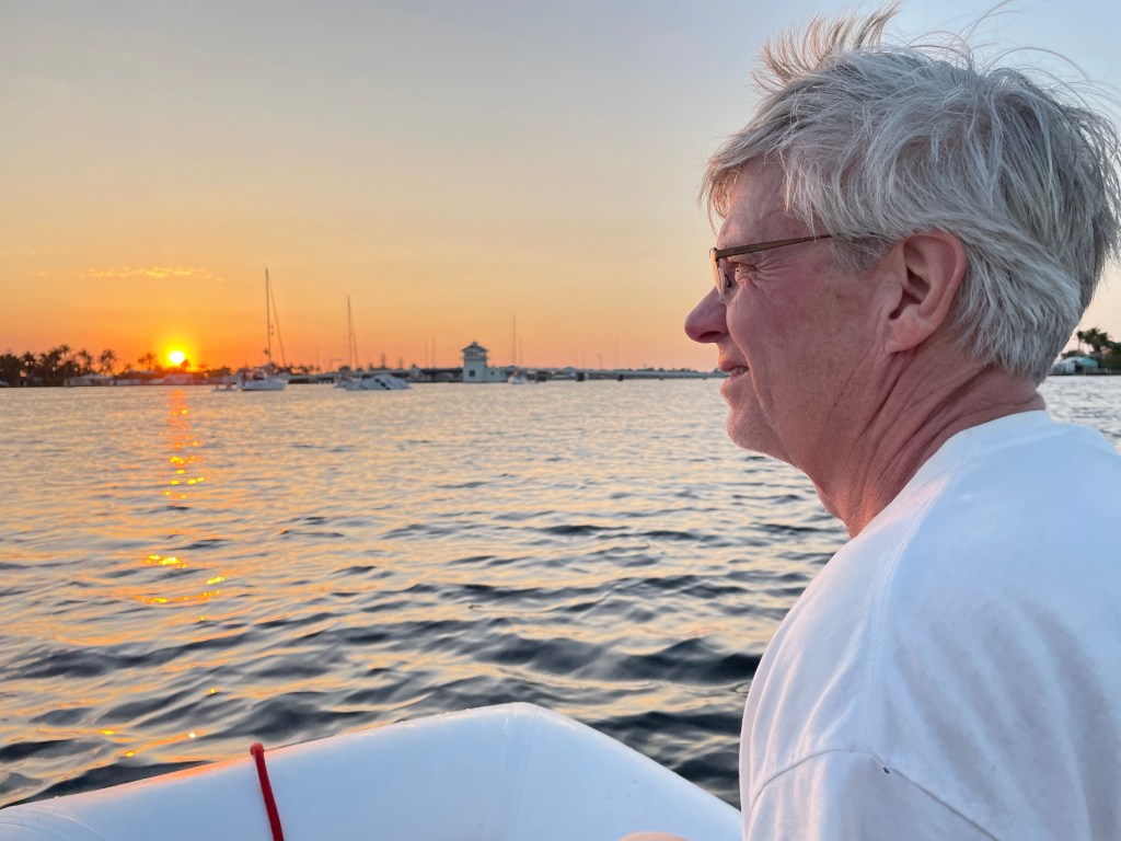 I kept the diesel running to get us home in time for Glenn to catch his flight and was shocked and dismayed when it surged a few times and stopped. The batteries were good but I couldn’t get it to start, so we sailed. Glenn and I ran through the possibilities , none of which were easy fixes. Finally, just because I could , I took the 1.5 gallons of diesel that was stowed in the lazarette for emergencies and dumped it into the tank. She fired right up! It’s a mystery, I’d just polished the gas and topped off the tank. There was no way we could have burned 11 gallons of diesel in the last couple of days. Maybe there was a problem with the fuel filter, or maybe, I’d only thought I’d filled the tank. Regardless, the engine was running again and I wouldn’t need to beg a tow or attempt to sail into the canal system. The ride back to Punta Gorda was a quick close reach, in 18 knots of wind. At one point the wind caught the dingy and I had to go forward to secure it.