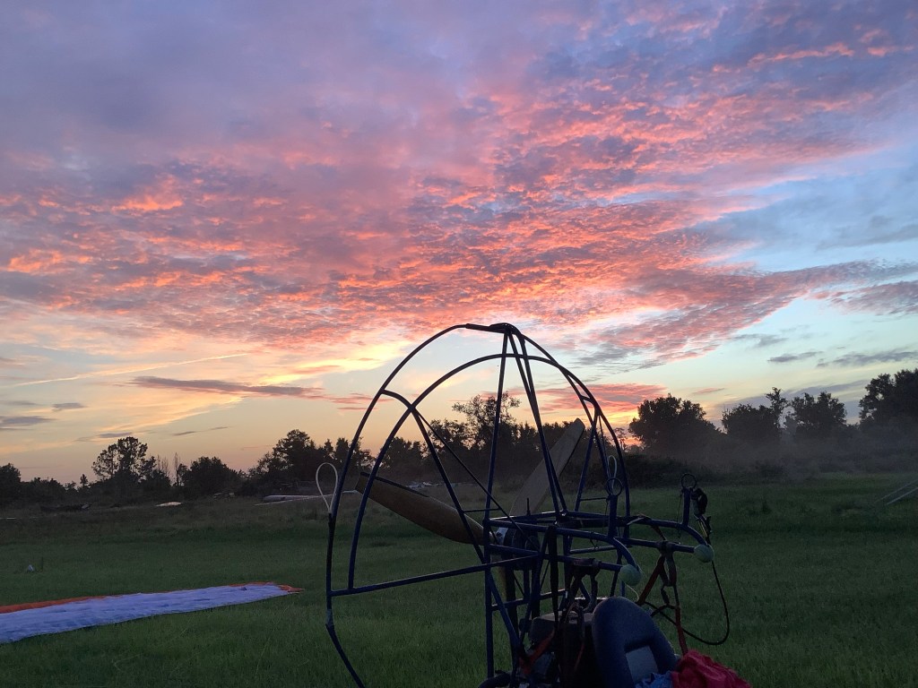 At 4:45 the alarm went off. I went through the usual rituals and hit the road. Then everything went to hell. We were to meet at the Orlando LZ and I got lost. Nothing looked right. I turned on Orlando and drove right past the LZ. When I realized I missed it I texted Mike and he said they were launching from Yorkshire instead. Yorkshire?, Yorkshire? I knew I’d flown from there recently but I couldn’t for the life of me, remember where it was. I was fishing on the nav app trying to figure it out when I got a text from Mike that they were going back to Orlando. I’d just been there so I pulled a u-turn and after 5 minutes of driving around and once pulling within 500 feet of the gang and turning around again, we finally hooked up. Luckily we planned the meet a little early and it was still nautical twilight.