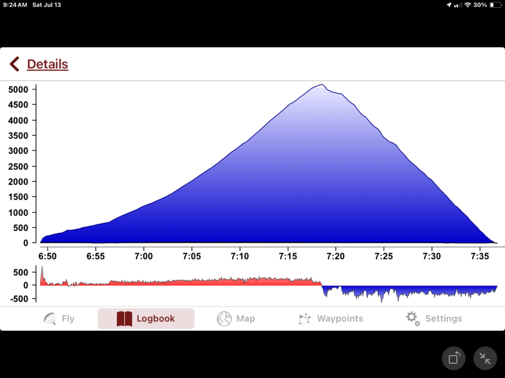 Climbed to 5100 ft AGL and enjoyed the chill… until I didn’t. No Drama. WTS toggle line was a little conflicted which caused a slight pull to the left on take-off but not enough to abort. As soon as I was up and climbing I sorted it out.